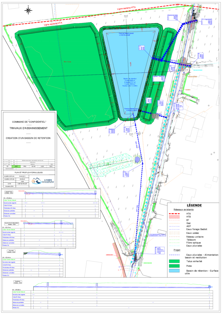 - Plan du bassin de rétention avec réseaux d’alimentation, restitution, trop plein et profils hydrauliques associés